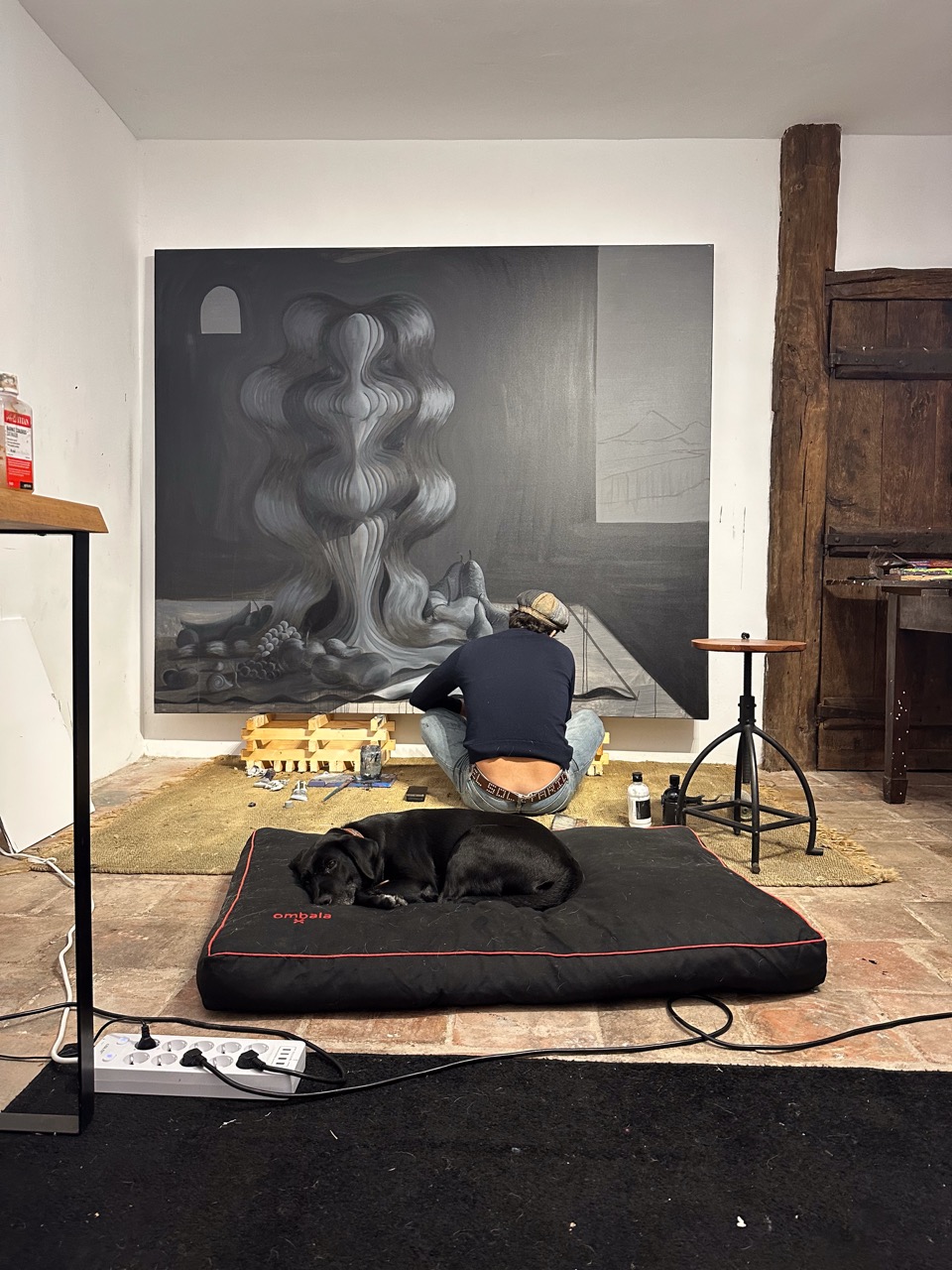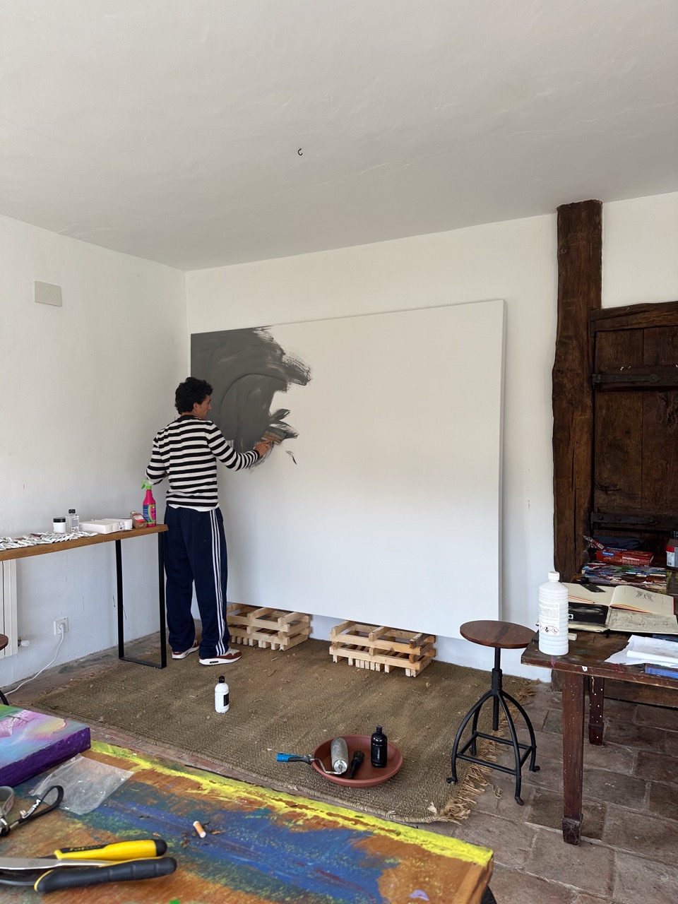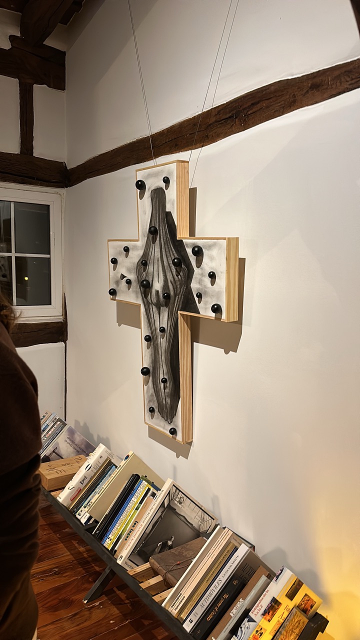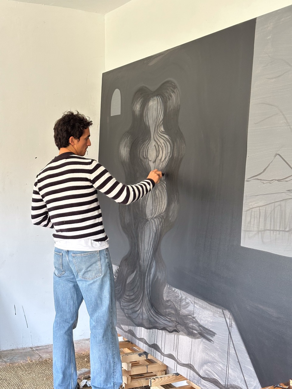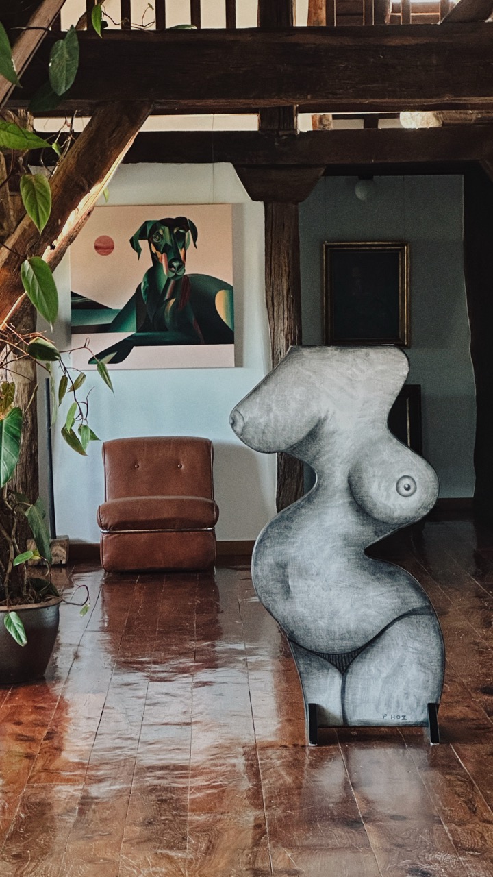 His pictorial gesture, free from planning, is driven by intuition and allows forms to reveal themselves through the process: fragmented figures, improbable anatomies, liquid architectures, and signs that elude narrative interpretation.